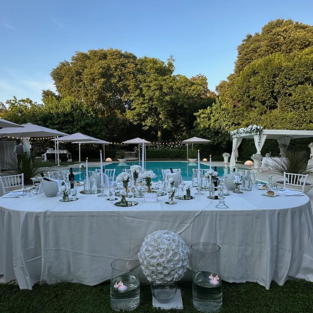 Il gran finale si svolge nella suggestiva Barchessa, con il buffet di dolci, la romantica confettata e, ovviamente, il momento più atteso: la torta nuziale servita a bordo piscina, incorniciata da uno spettacolo di fuochi d’artificio.